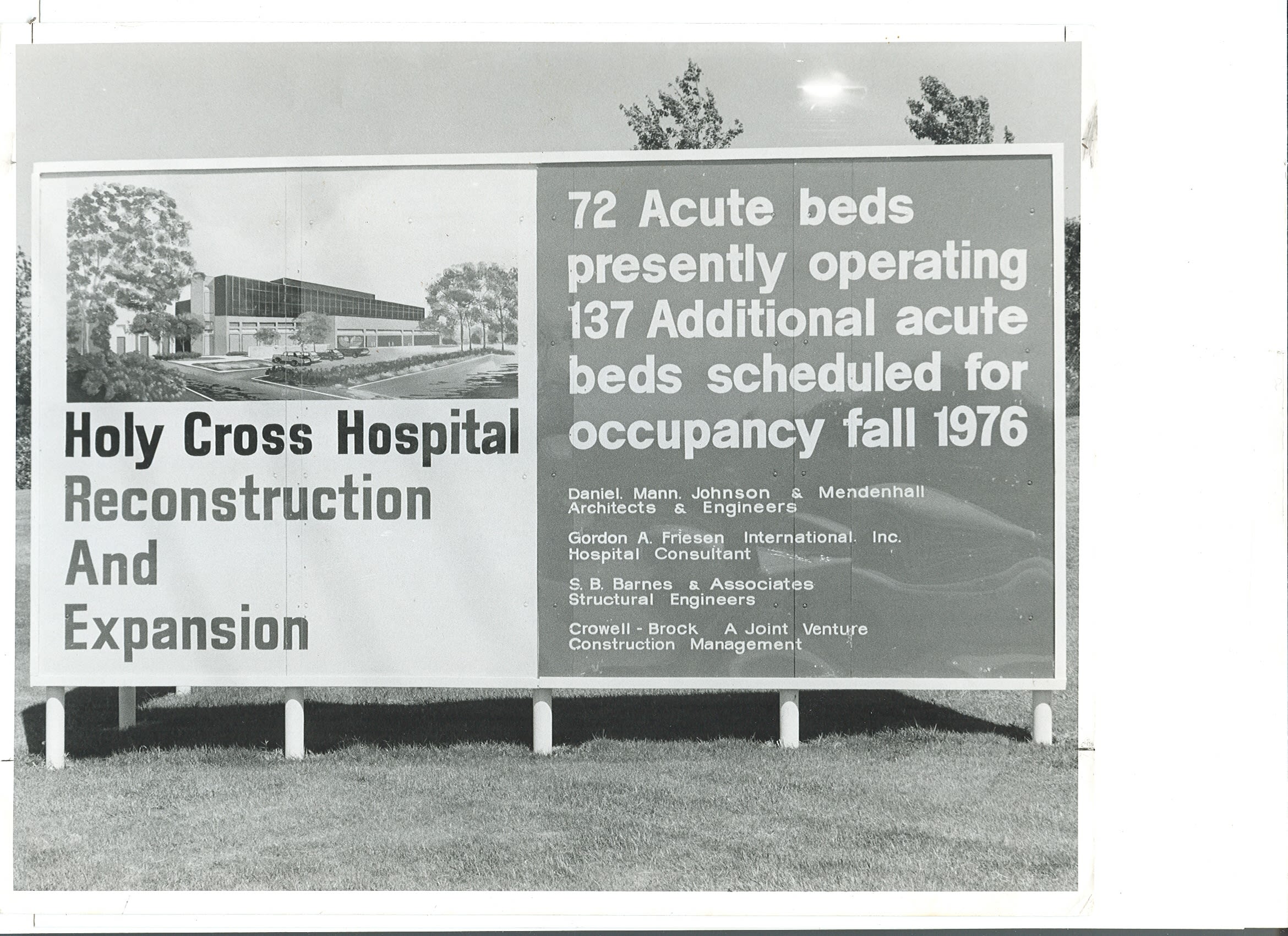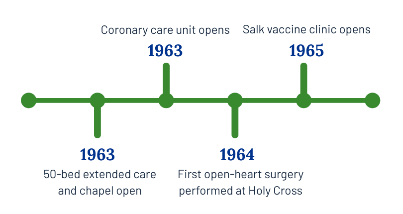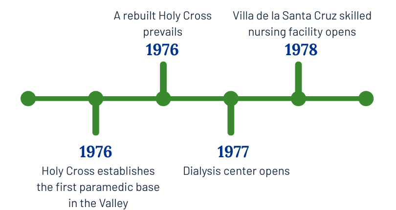 In response to a critical bed shortage and a rapidly growing population in the San Fernando Valley, a small group of civic leaders, led by Mr. Al Ghirardelli, caravanned to Fresno to invite the Sisters of the Holy Cross to build a hospital in Mission Hills.