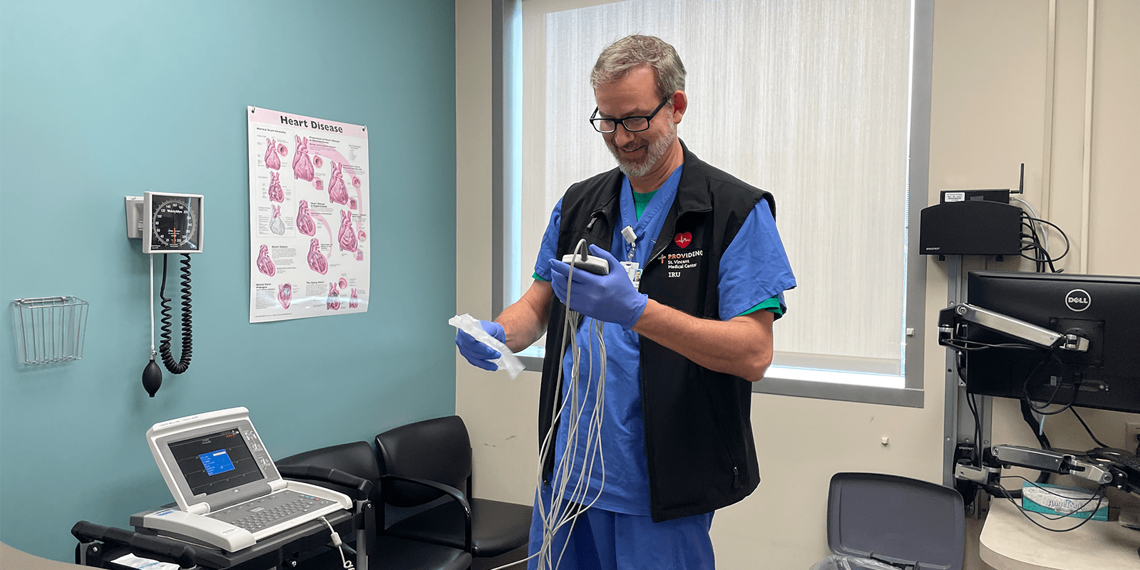 Above: Jason Phillips, RN, cleans and organizes the electrocardiogram (ECG) nodes for the next patient. The entire process from setup to screening takes about 15 minutes.